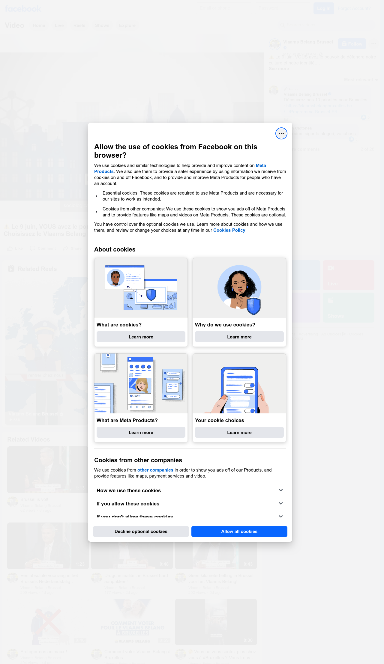| content | ⚠️ Le 9 juin, VOUS avez le pouvoir de défendre notre culture et notre identité. ✅ Choisissez le Vlaams Belang à #Bruxelles !Facebook Log In Log In Forgot Account? See more on Facebook See more on Facebook Email or phone number Password Log In Forgot password? or Create new account Allow the use of cookies from Facebook on this browser? We use cookies and similar technologies to help provide and improve content on Meta Products . We also use them to provide a safer experience by using information we receive from cookies on and off Facebook, and to provide and improve Meta Products for people who have an account. Essential cookies: These cookies are required to use Meta Products and are necessary for our sites to work as intended. Cookies from other companies: We use these cookies to show you ads off of Meta Products and to provide features like maps and videos on Meta Products. These cookies are optional. You have control over the optional cookies we use. Learn more about cookies and how we use them, and review or change your choices at any time in our Cookies Policy . About cookies What are cookies? Learn more Why do we use cookies? Learn more What are Meta Products? Learn more Your cookie choices Learn more Cookies from other companies We use cookies from other companies in order to show you ads off of our Products, and provide features like maps, payment services and video. How we use these cookies If you allow these cookies If you don't allow these cookies Other ways you can control your information Manage your ad experience in Accounts Center More information about online advertising Controlling cookies with browser settings Allow all cookies Decline optional cookies Allow all cookies Decline optional cookies |